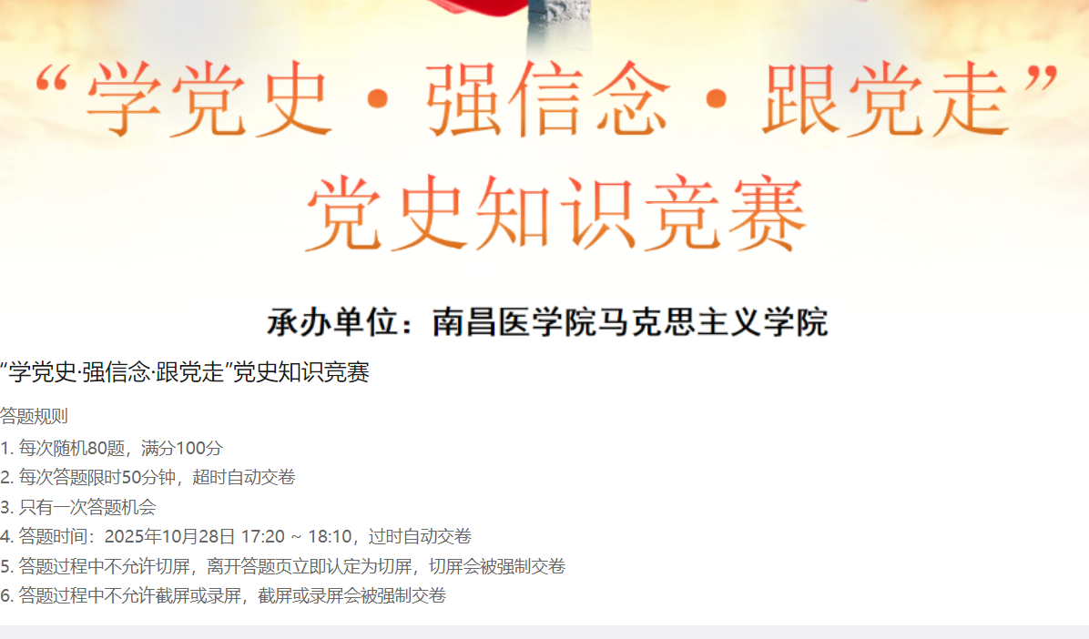 竞赛面向全校2024级、2025级全体学生,创新采用线上线下相结合的方式进行。组委会于10月27日组织线上模拟测试,帮助学生熟悉流程;正式竞赛于10月28日以线上集中测试形式开展。内容涵盖党史、新中国史、改革开放史、社会主义发展史,重点考察学生对党的创新理论、百年光辉历程以及新时代党的使命任务的理解与掌握。